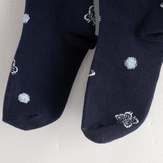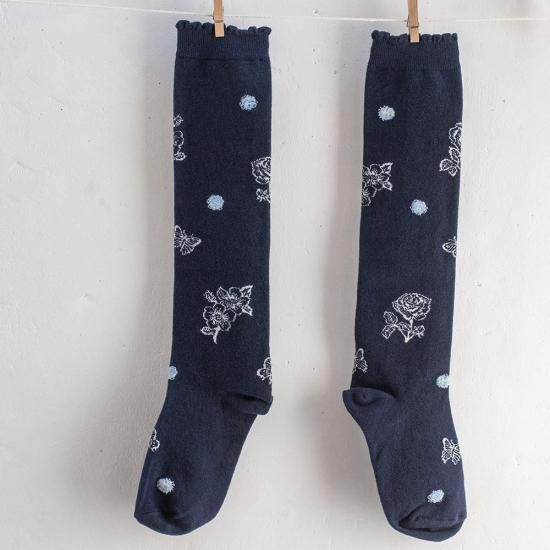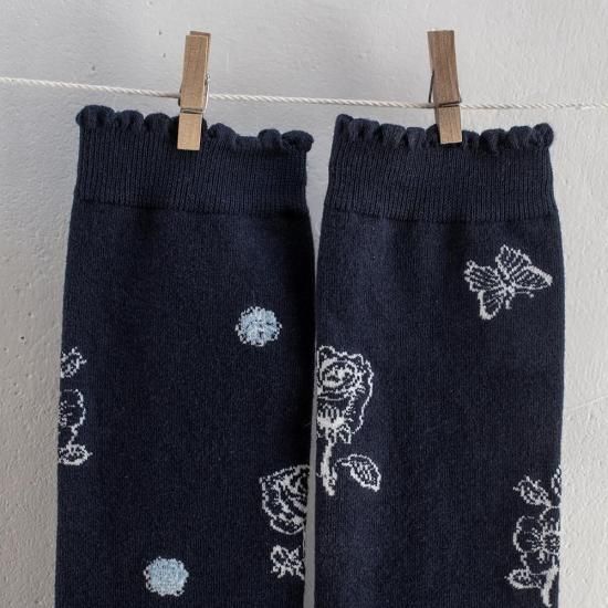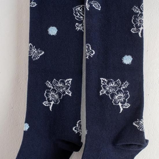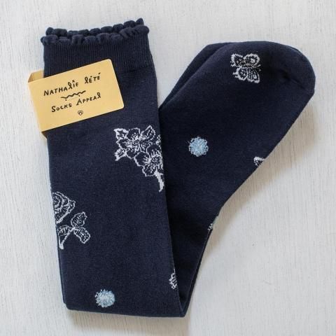 ネイビーのソックスには、白と水色で描かれた清楚な印象の花のイラストが。