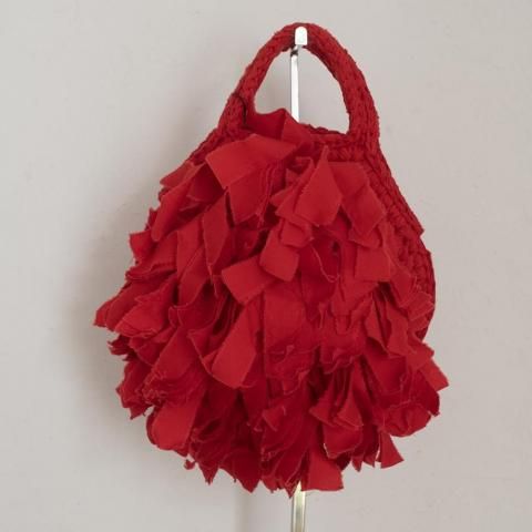 片側にたっぷりとフリンジをつけた、ラウンド型の裂き編みバッグ。荷物をたくさん入れて膨らませると、より立体感がでて華やかな印象に。パーティーバッグとしても使え、ファッションのアクセントにぴったりなバッグです。