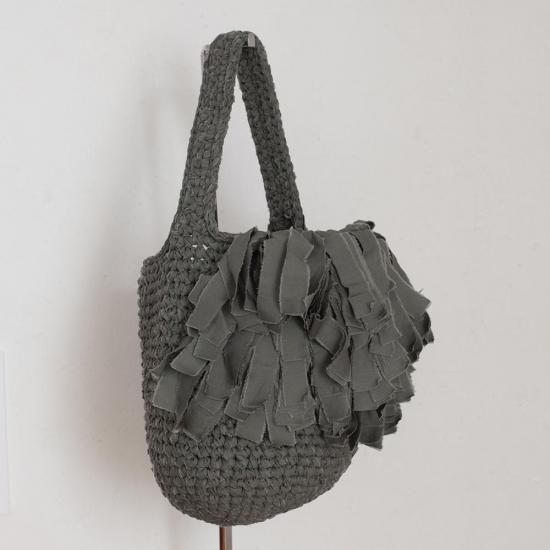 片側にたっぷりとフリンジをつけた、バケツ型のショルダーバッグ。マチ付きなので、たっぷりと収納でき、肩に掛けて持ち歩けるので、フアッションのアクセントとしてはもちろん、お買い物など、デイリー用として大活躍するバッグです。